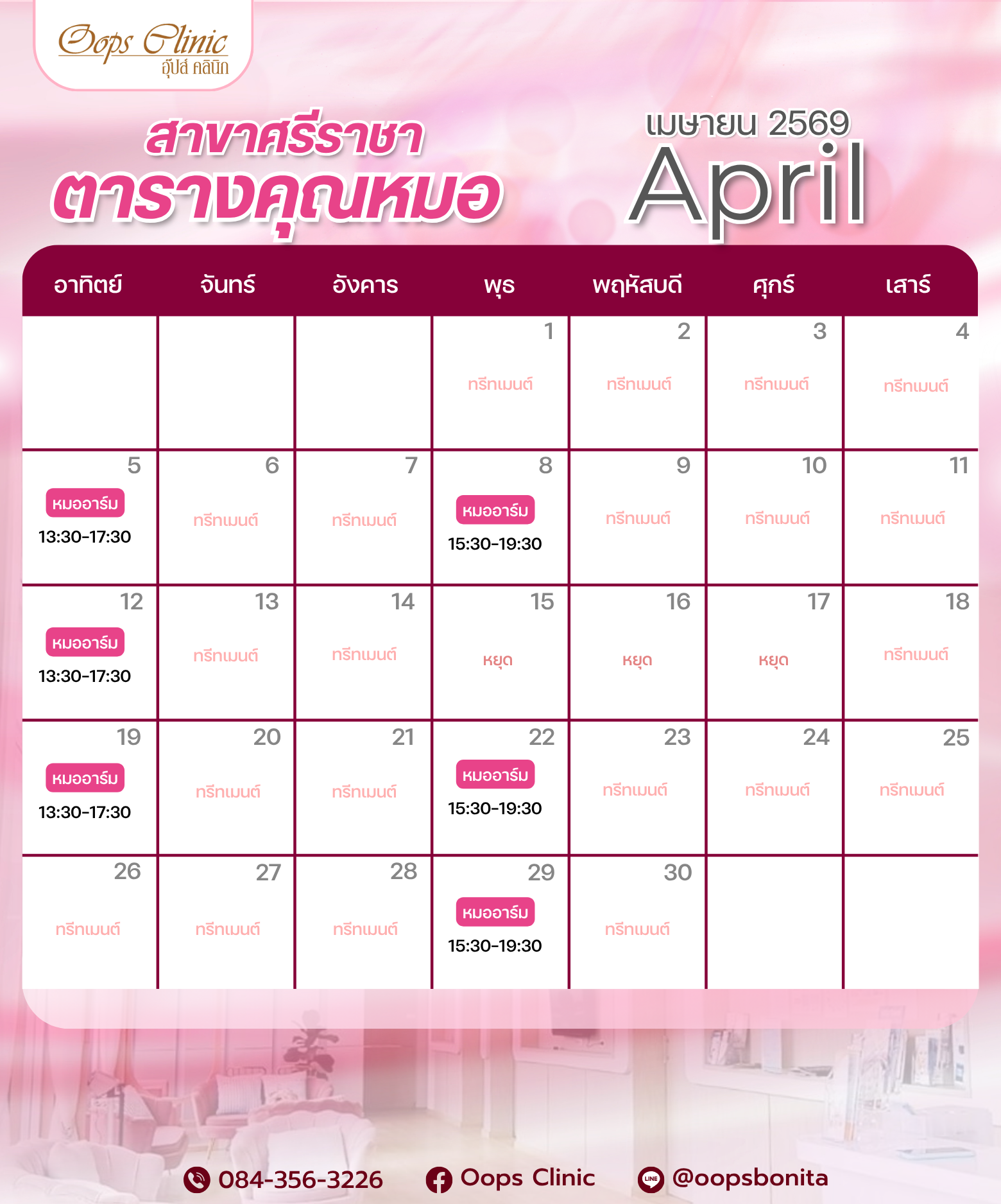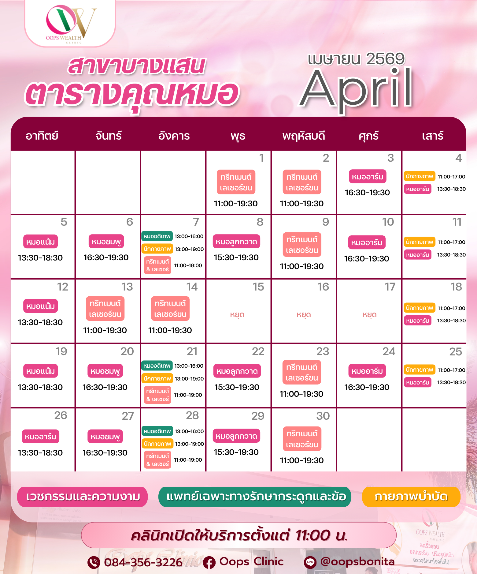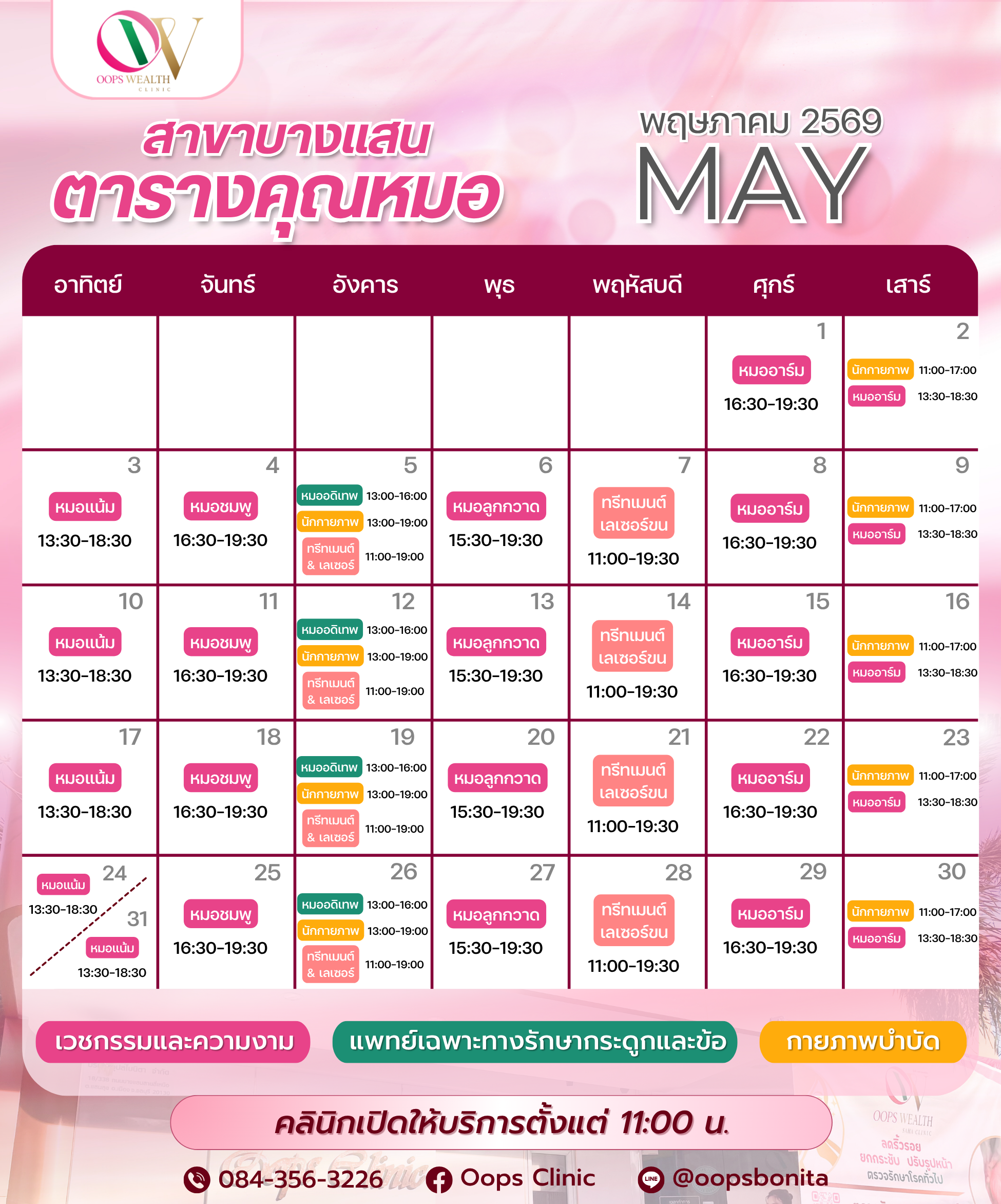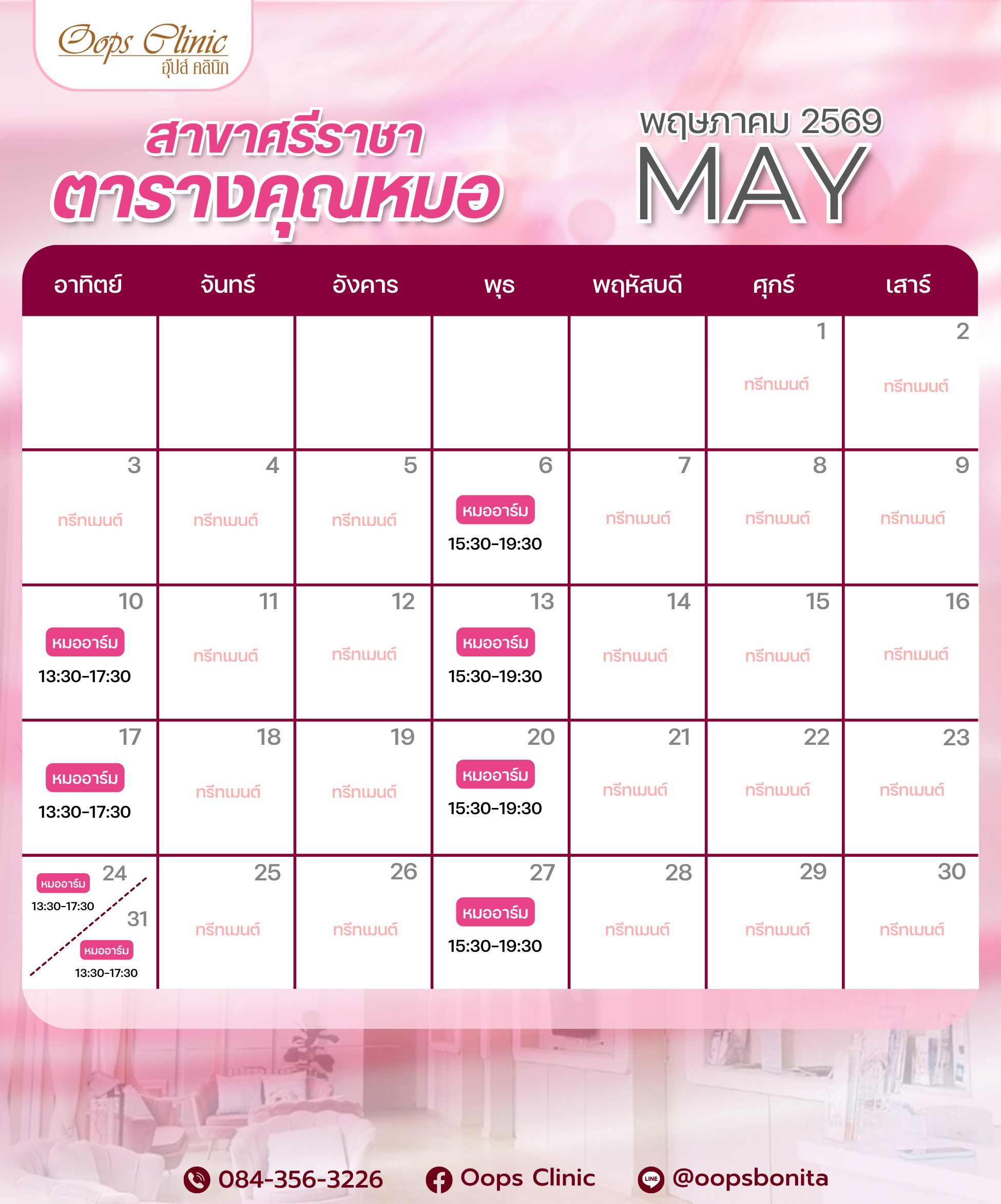 อัพเดตหลังวันที่ 20 ของทุกเดือน เวลาแพทย์อาจมีการเปลี่ยนแปลงกรุณาตรวจสอบเวลาก่อนเข้าใช้บริการนะคะ